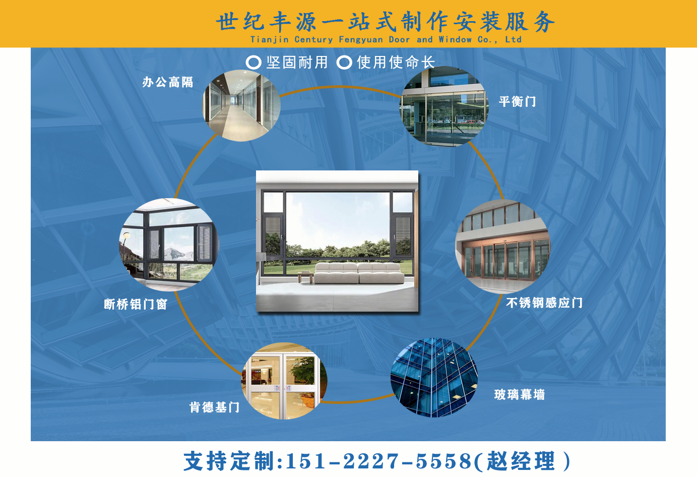天津世紀(jì)豐源門窗有限公司從事斷橋鋁門窗,玻璃幕墻,平衡門,肯德基門,不銹鋼感應(yīng)門,百葉窗,辦公高隔,制作安裝一站式訂制生產(chǎn)及配套服務(wù)等。 公司自成立以來,始終堅(jiān)持以人才為本、誠信立業(yè)的經(jīng)營原則,薈萃業(yè)界精英,成熟的技術(shù)、管理方法及企業(yè)經(jīng)驗(yàn)與國內(nèi)企業(yè)的具體實(shí)際相結(jié)合,為企業(yè)供給各個方面的解決方案,使企業(yè)在激烈的市場競爭中始終堅(jiān)持競爭力,實(shí)現(xiàn)企業(yè)快速、穩(wěn)定地發(fā)展。 質(zhì)量好、服務(wù)好、才能信譽(yù)好,公司已在諸多領(lǐng)域取得輝煌成績,愿意成為您可信賴的長期合作伙伴。 讓我們攜手同行,共同實(shí)現(xiàn)“讓普通老百姓都用得上高端門窗”...
